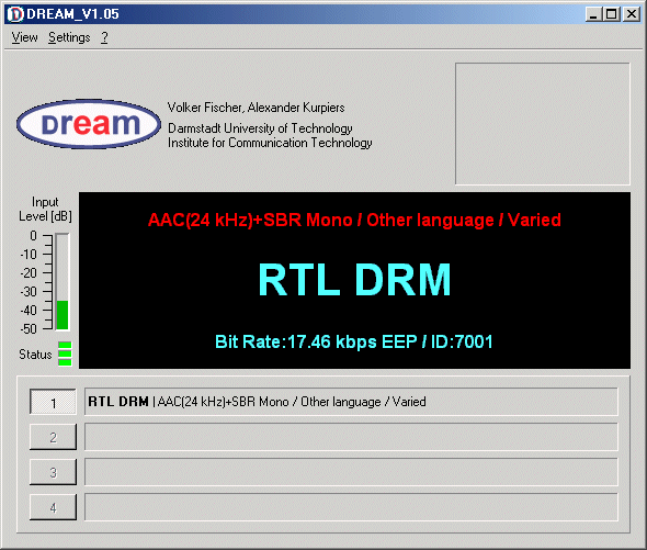 Das folgende Bild zeigt DREAM beim Empfang des DRM-Senders von RTL auf 6095 kHz. Der Sender überträgt zugleich die Stationskennung, die hier auf dem Bildschirm angezeigt wird. Als Empfänger diente der Radiomann. Statt eines Kopfhörers wird ein Stereo-Verbindungskabel zum Eingang "Line In" an der Soundkarte des Computers angeschlossen. DREAM liest dann das Ausgangssignal des Empfängers und macht daraus einen Audio-Datenstrom. Sprache und Musik ertönen aus dem PC-Lautsprecher. Das besondere an DRM ist sein glasklarer Klang ohne Nebengeräusche und Lautstärkeschwankungen. Die Tonqualität ist ähnlich gut wie beim UKW-Rundfunk, und das bei Reichweiten bis zu einigen tausend Kilometern.