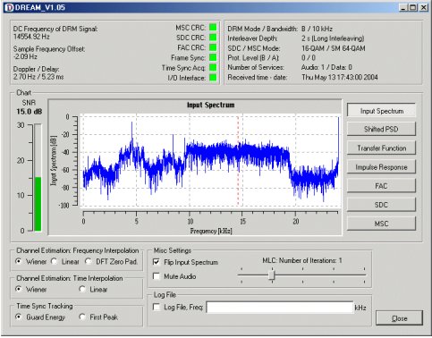 Wenn du einen DRM-Sender gefunden und etwa auf 12 kHz abgestimmt hast, entferne dich etwas von deinem Radio, um eine Verstimmung durch Handkapazitäten zu vermeiden. Beobachte dann das Auswertefenster von DREAM. Mit etwas Glück kann sich die Software auf das Signal synchronisieren. Di siehst dann eine gestrichelte Linie genau in der Mitte des DRM-Signals. Am linken Rand wird der Störanstand (Signal to Noise Ratio, SNR) angezeigt. Ab etwa 10 dB kann die Stationskennung empfangen werden. Klettert das SNR über etwa 15 dB, hört man plötzlich Sprache und Musik in digitaler Qualität. 10 dB (Dezibel) bedeutet übrigens eine zehnfach höhere Leistung als die Störungen.