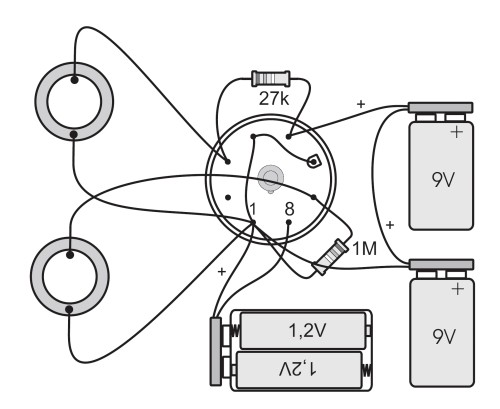 Beim Aufbau der Schaltung ist zu beachten, dass die Metallscheiben der Piezowandler an Masse, also am Minuspol der Anodenbatterie liegen. So verhindert man Kurzschlüsse, wenn die Scheiben sich berühren.