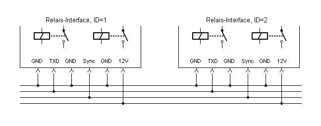 Alle Interfaces werden durch Verlängerungskabel parallel geschaltet. Daten auf der Sendeleitung TXD werden vom PC an alle Geräte gesendet. Außerdem wird über das Kabel die Betriebsspannung weitergeleitet. Es genügt daher, ein Gerät mit einem Steckernetzteil zu verbinden, und so gleich mehrere Relaiskarten zu versorgen. Zusätzlich gibt es ein Synchronisationsleitung, die alle angeschlossenen Geräte verbindet. Sie dient dazu, eine zeitliche Koordinierung zwischen den Geräten zu erreichen.