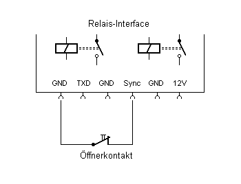 Ein externer Schalter (Öffner) kann ebenfalls das Startsignal für Einzeldurchläufe liefern. Damit lassen sich z.B. auf Knopfdruck oder durch eine Lichtschranke Programmdurchläufe abrufen. Hier bietet sich also die Möglichkeit, einen programmierten Ablauf durch ein externes Ereignis zu steuern. Mit dieser Steuerung hat man erst die Möglichkeit, Vorgänge sinnvoll zu automatisieren, wobei das Relais-Inteface nur einmal am PC programmiert werden muss, dann aber jahrelang seine Aufgabe allein erfüllen kann.