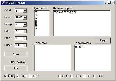 Das in Kapitel 3 des Buchs entwickelte und im Quelltext vorgestellte RS232-Terminal eignet sich als allgemeines Testwerkzeug in der Software- und Hardware-Entwicklung. Bei der Ausgabe kann der Anwender entweder im Byteformat oder im Textformat senden. Alle empfangenen Zeichen werden sowohl als Bytes und als Text angezeigt. Zusätzlich hat man die Kontrolle über alle Handshakeleitungen des Systems. Also wenn das nächste Mal ein störrisches Gerät mit RS232 auftaucht, sollte man ihm mit TERMINAL.EXE auf die Finger schauen.