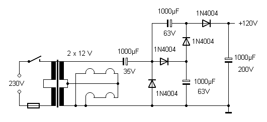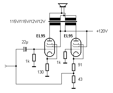 Der Netztrafo hat zwei Wicklungen mit 12 V. Er sollte die Heizspannung und zugleich auch die Anodenspannung liefern. Mit einer Spannungsvervierfachung werden aus 24 V Wechselspannung 120V Gleichspannung erzeugt. Das ist für eine EL95 nicht gerade viel. Eine Endstufe im reinen A-Betrieb würde zu wenig Ausgangsspannung liefern. Deshalb wurde hier eine einfache Gegentaktstufe für AB-Betrieb entwickelt (vgl. Gegentakt-AB mit EL504).