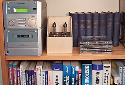 Die Wahl der Röhren fiel auf die EL95, weil ich einen besonders kleinen Verstärker brauchte, der neben der Mini-Kompaktanlage im Bücherregal Platz findet. Dort stand bisher immer ein kleines CD-Magazin aus Holz. Damit ich nicht noch aufräumen oder sogar Bücher wegwerfen musste, sollte der ganze Verstärker in dieses Holzgehäuse passen. Mit der EL95 war das zu schaffen. Unten im Gehäuse befinden sich das Netzteil und die Ausgangstrafos. Die Röhrenfassungen sind auf schwarzem Platinenmaterial befestigt.