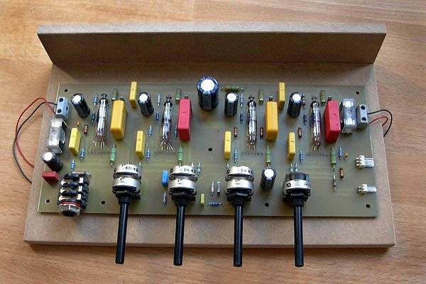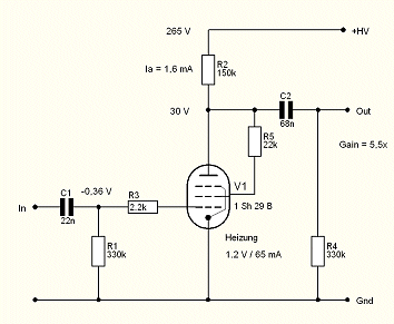 Ich habe aus meinem 1Sh29B-Platinenmodul einen Gitarren-Vorverstärker gebaut, komplett mit Drive-, Bass-, Treble- und Volume-Regler. Das Volume-Poti schaltet zusätzlich einen Gleichspannungsausgang für die Stand-by-Funktion der Endstufe. Insgesamt erreiche ich mit den vier Röhren eine Gesamtverstärkung von über 40 dB, der Frequenzgang ginge bis 70 kHz, wird aber auf knapp 40 kHz begrenzt. Als Versorgungsspannungen sind +5 V und +220 V erforderlich. Der Stromverbrauch ist extrem gering.