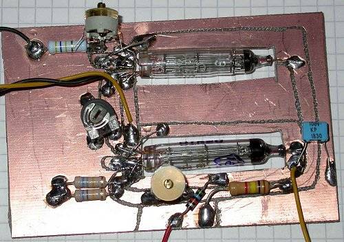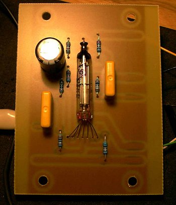 Da Sie sich ja auch sehr intensiv mit den russischen Röhren befassen, möchte ich Ihnen anhand eines kleinen fremdsteuerbaren Multivibs eine alternative Montagemethode für die Röhren vorstellen Eine weitere Idee habe ich noch nicht realisiert: eine so hergestellte Platine kann ja auch einen Sockel darstellen, der dann in eine Steckleiste eingesetzt werden kann (Platinenstecker wie bei PC-Karten) Die Ausschnitte wurden mit einer kleinen Trennscheibe hergestellt, die Leiterbahnen sind gefräst (nicht schön aber praktisch und schnell für Einzelstücke:-) ).