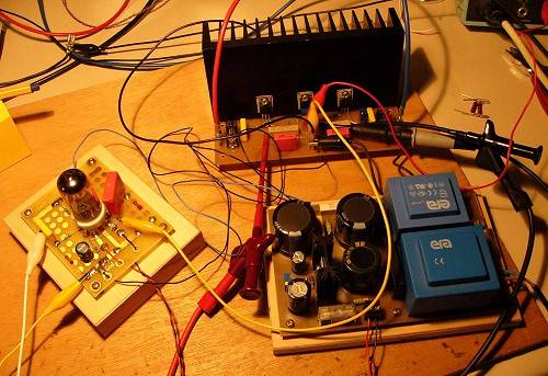Trioden in der Vor- und Treiberstufe und Power-MOSFETs in der Endstufe bringen Röhrenklang und viel Ausgangsleistung ohne einen teuren Übertrager. Diesen interessanten Versucht Beschreibt Michael Gaedtke auf seiner Homepage im Detail: