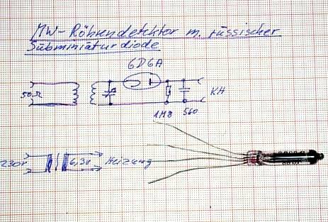 Sie hatten offensichtlich Recht mit Ihrer Vermutung, dass das russische Röhrensortiment bei Pollin nicht immer den gleichen Inhalt hat. In einem kürzlich erhaltenen Paket fand ich u.a. eine Subminiaturdiode (6D6A) - das war neu... Tja, und dann ging es mir genau wie Ihnen mit der EAA91: "Was tun mit einer Röhrendiode?". Nachdem ich einige Zeit im Internet nach Anwendungen gesucht habe, frage ich mich wirklich, wozu man diese Röhre überhaupt gebaut hat - jedenfalls konnte ich nur eine einzige Schaltung finden, in der die Röhre verwendet wurde: ein russisches Röhren-Autoradio ;-) OK, also hab ich mich Ihnen angeschlossen und einen Mittelwellen-Detektor aufgebaut.