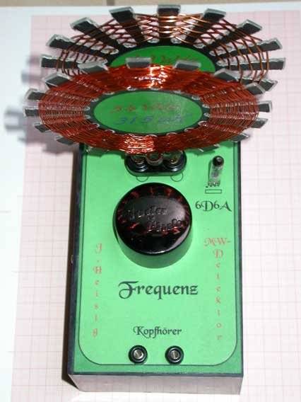 Nebenbei: der Detektor müsste eigentlich "Pollin-Detektor" heißen - er besteht zu 99,9% aus Pollin-Teilen. Ausnahmen: Drehknopf (Deckel einer SodaClub-Flasche nach dem Verfallsdatum), eingeklebter Skalenknopf - Spulenköper: CD, Ausschnitte gesägt mit Styrosäge ("heisser Draht").