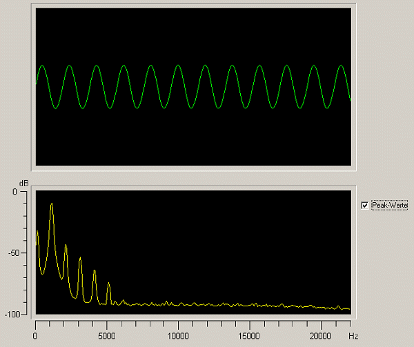 Hier wurde das Klirrspektrum meines Röhren-Gitarren-Vorverstärkers aufgenommen. Wenn man die Verstärkung mit einem Regler am Eingang hochzieht und dafür am Ausgang abschwächt, dann wird der Lattenzaun mit Oberwellen länger und höher - es entstehen mehr Oberwellen. Ich habe gelesen, dass ein "guter Röhrenklang" vor allem durch ein gleichmäßig abklingendes Klirrspektrum ohne sehr hohe Oberwellenzahlen gekennzeichnet sein soll (sagen die echten Freaks). Das müsste schon so ähnlich aussehen.