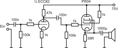 Ich habe mich von ihrem PL(EL)504 Verstärker inspirieren lassen und ihn zu einem Kopfhörerverstärker umgebaut. Ein schönes einfaches Projekt, das wenig Geld kostet. Mein Aufbau entspricht genau dem Schaltplan, als Quelle dient momentan ein Discman, aber später soll der Verstärker mal in den Computer wandern und von der Soundkarte gespeist werden. Ich habe bei meinem Aufbau einen Ruhestrom von 94mA gemessen. Wegen dem hohen Strom treibt der Verstärker auch 32ohm Kopfhörer mit hoher Lautstärke und wunderbarem Klang. Der Schirmgitterwiderstand ist mit 1kohm recht klein, aber die von ihnen beschriebenen Probleme die durch Sekundärelektronen auftreten können, habe ich glücklicherweise nicht festgestellt. Der Widerstand muss aber so klein sein, sonst sinkt der Anodenstrom.