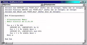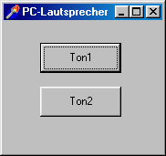 Das Programm soll ein einfaches Formular mit einer Schaltfläche "Ton" verwenden. Die Lautsprecherleitung wird 100 mal ein- und ausgeschaltet. Damit man z.B. bei einem PC mit 200 MHz überhaupt einen Ton hören kann, müssen zusätzliche Wartezeiten eingefügt werden. Sie werden hier durch Zählschleifen bis 10000 gebildet.