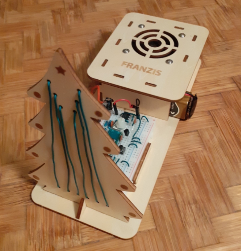 Breadboard und ganz ohne die Holzteile. Batterie und Lautsprecher