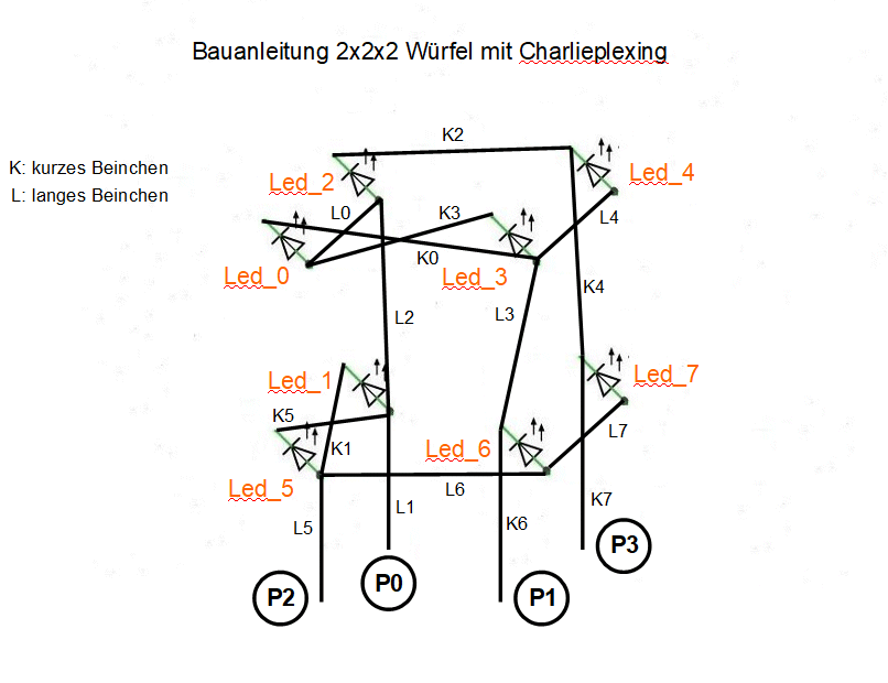 Mit nur acht LEDs kann man einen kleinen Würfel mit LEDs an den acht Ecken bauen.
