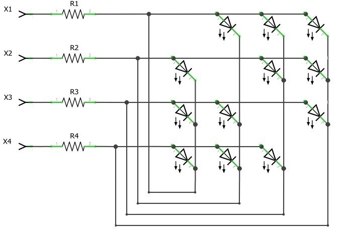 Charlielexing. Jede der vier Leitungen steuert zwei LEDs in beiden