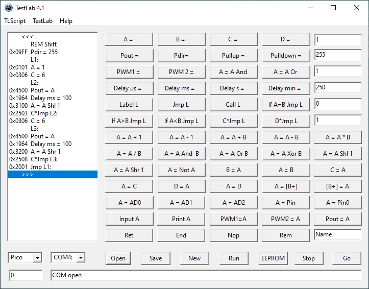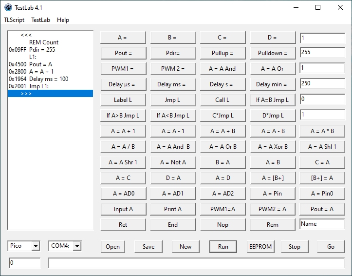TestLab Script kennt nur vier Byte-Variablen, A, B, C und D. Dabei ist A