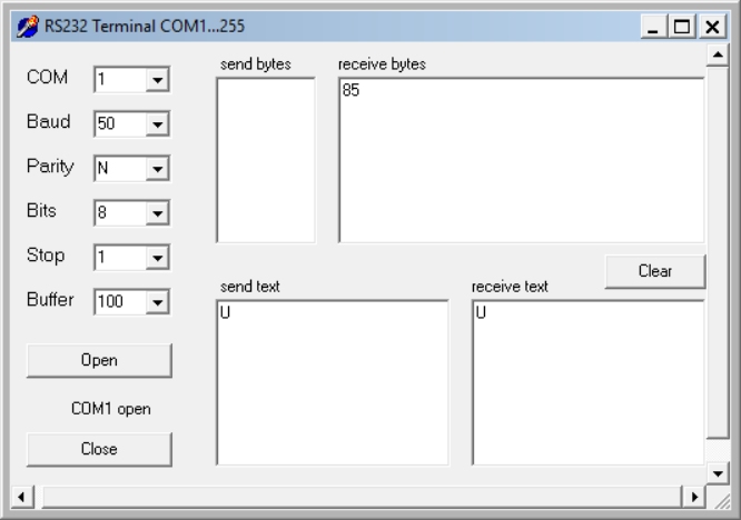 Byte-Empfangsfenster sieht man, dass das U als ASCII-Zeichen 85