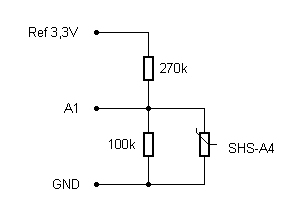 Der Analogwander AD210 hat eine Referenzspannung von 3,3 V. Mit einem Spannungsteiler 270k/100k wird die Sensorspannung auf 0,8 V begrenzt. Die Messspannung liegt bei fast Null für trockene Luft und bei fast 0,8 V bei Betauung, also relativer Feuchte 100%. Zum Test reicht es den Sensor anzuhauchen.