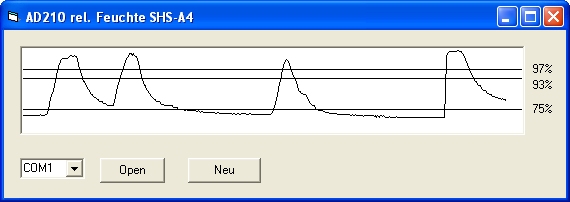 Für die Langzeitbeobachtung ist eine grafische Anzeige günstiger. Das Diagramm enthält drei Referenzlinien für 75% (0,20 V), 93 % (0,51 V) und 97 % (0,60 V). So kann man leicht erkennen ob die Feuchte in die Nähe des Kondensationspunktes kommt.