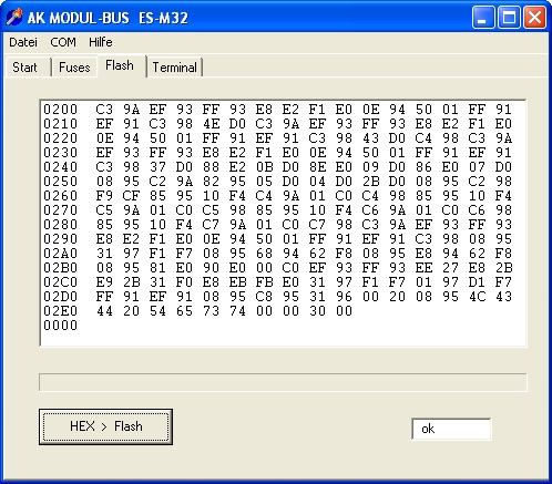 „HEX-Flash“ öffnet ein Datei-Menü. Nach der Auswahl einer Hex-Datei wird ihr