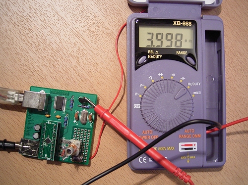 Vergleichsmessung mit dem Multifunktionszähler F1000 zeigt 4,000117 MHz. Das Multimeter ist also weniger genau, dafür aber preiswert und besonders bequem einsetzbar.