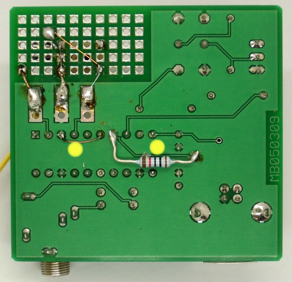 Die zweite Änderung (rechter gelber Punkt) dient der Verbesserung des Störabstands. Die Datenleitungen SDA und SCL tragen steile Impulse, die HF-Störungen verursachen können. Vor allem den Datenverkehr beim Betrieb von RDS kann man hören.  Die SDA-Leitung ist bereits über einen 10-k-Widerstand geführt, was die Störungen dämpft. Der zusätzliche 10-k-Widerstand in der SCL-Leitung dämpft auch deren Störungen. Für diese Änderung muss eine Leitung auf der Platinen-Unterseite durchtrennt und mit dem Widerstand überbrückt werden.