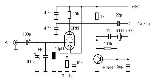 Die Schaltung verwendet die Röhre in einer Mischstufe mit einem Transistor-Quarzoszillator