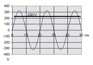 | Während Batterien Gleichstrom liefern, verwendet man im Lichtnetz Wechselstrom. Die Polarität der Wechselspannung kehrt sich mit einer Frequenz f laufend um. An der Steckdose findet man eine Wechselspannung mit 230 V bei einer Frequenz von 50 Hertz (Hz), also mit 50 vollständigen Wechseln in einer Sekunde. Eine volle Periode dauert 20 Millisekunden. Die höchste Momentanspannung liegt bei ca. 325 V. Die Effektivspannung Ueff beträgt 230 V. Das bedeutet, dass an einem Ohmschen Widerstand bei einer Gleichspannung von 230 V die gleiche mittlere Leistung umgesetzt wird. Mit einem Oszilloskop lässt sich der zeitliche Verlauf der sinusfömigen Wechselspannung sichtbar machen. |