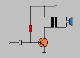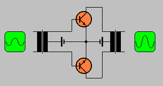 Ein vollständiger Gegentaktverstärker wird meist mit einer Treiberstufe kombiniert. Außerdem kommt eine Gegenkopplung über den gesamten Verstärker zu Einsatz. Man kann mit einer einfachen Betriebsspannung auskommen, wenn man den Lautsprecher über einen großen Elektrolytkondensator ankoppelt. Der Kondensator wird bei der positiven Halbwelle geladen und wirkt während der negativen Halbwelle als Stromquelle, ersetzt also die zweite Batterie. |