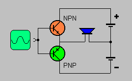 Heute versucht man meist Trafos zu vermeiden, weil sie teuer sind und selbst Verzerrungen erzeugen können. Statt dessen setzt man komplementäre Transistoren, also NPN- und PNP-Transistoren gleicher Daten ein, die ja vom Prinzip her unterschiedliche Stromrichtungen verstärken. Meist werden die Transistoren in Kollektorschaltung betrieben. Siehe auch: Röhren-Gegentaktverstärker |