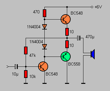 | Die Schaltung weist einen Ruhestrom von ca. 10 mA auf. Bei einer Versorgungsspannung von 6 V wird mit Kleinleistungstransistoren BC548/BC558 ohne besondere Kühlung eine Leistung von ca. 0,5 W erreicht, was für viele Fälle, wie z.B. Radios, Gegensprechanlagen usw. ausreicht. |