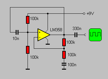 | Wie jeder Verstärker, so lässt sich auch der OPV zur Erzeugung von Schwingungen einsetzen. Dazu ist eine Rückkopplung auf den nichtinvertierenden Eingang erforderlich. Ohne besondere Maßnahmen wird der Verstärker übersteuern und ein Rechtecksignal liefern. |