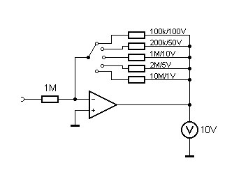 | Ein Messgerät für den allgemeinen Einsatz im Labor sollte einen gewissen Eingangswiderstand besitzen, weil damit gesichert wird, dass bei offenen Eingängen die Spannung Null angezeigt wird. Mit einem Operationsverstärker lässt sich erreichen, dass bei unterschiedlichen Eingangsbereichen immer derselbe Eingangswiderstand vorliegt. Man schaltet dazu Widerstände im Gegenkoppelzweig um. Es muss beachtet werden, dass der Verstärker die Spannung invertiert. Der OPV muss mit einer bipolaren Stromversorgung betrieben werden. Die Eingangsspannung des Messgeräts darf größer als die Betriebsspannung werden, da in der gegengekoppelten Schaltung die Spannung am invertierenden Eingang praktisch Null ist. Bei sehr empfindlichen Messbereichen muss die Offsetspannung des OPV abgeglichen werden. |