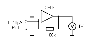 | Für Amperemeter muss allgemein ein möglichst geringer Innenwiderstand angestrebt werden, weil jeder Spannungsabfall am Messgerät zu einer ungewollten Beeinflussung des Messobjekts führt. Für kleinere Ströme bis zu wenigen mA kann durch den Einsatz eines gegengekoppelten OPVs ein Innenwiderstand von annähernd Null erreicht werden. Zugleich ermöglicht der Verstärker auch eine Verbesserung der Messempfindlichkeit bis in den Nanoamperebereich. Durch einfache Umschaltung der Gegenkopplungswiderstände lässt sich eine Bereichswahl vornehmen. |