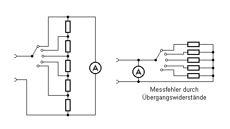 Ein Problem bei der Messbereichsumschaltung liegt darin, dass der Übergangswiderstand des Umschalters zu erheblichen Messfehlern führen kann, wenn man einfach verschiedene Shunts parallel zum Messwerk umschaltet. Besser ist es daher, verschiedene Shunts in Reihe zu schalten und nur die Eingangsklemmen umzuschalten. Eventuelle Spannungsabfälle an den Umschaltkontakten treten dann zwar nach außen hin auf, verändern jedoch nicht das Messergebnis. Außerdem kann beim Umschalten während einer Messung niemals der Fall eintreten, dass das Messgerät ohne Parallelwiderstand überlastet wird. |