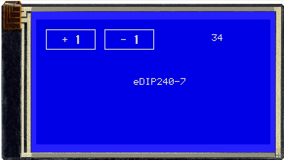 Das eDIP240-7 ist mit einem Touch-Panel ausgestattet, das komplett unter der Kontrolle des Displaycontrollers steht. Der Programmierer kann Schaltflächen festlegen, die mit einem Rahmen und einen Test angezeigt werden.