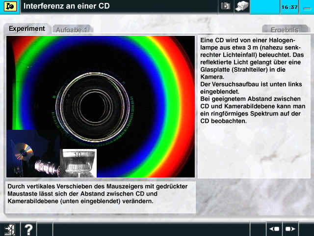 Die Abbildung zeigt einen Ausschnitt aus der brandneuen Multimedia-Produktion "Interaktive Bildschirmexperimente Optik": Die Interferenz am Reflexionsgitter wird am Beispiel einer CD-Oberfläche dargestellt.