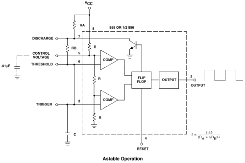 Datenblätter zu integrierten Schaltungen liefern als wichtigste Information grundsätzlich die Anschlussbelegung. Meist werden zusätzlich aber auch typische Anwendungsschaltungen gezeigt. Für den Präzisionstimer NE555 gibt der Hersteller die typische Grundschaltung eines Rechteckgenerators an. Natürlich fehlen auch nicht die Berechnungsgrundlagen für die erzeugte Frequenz.