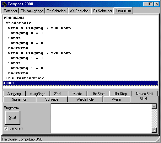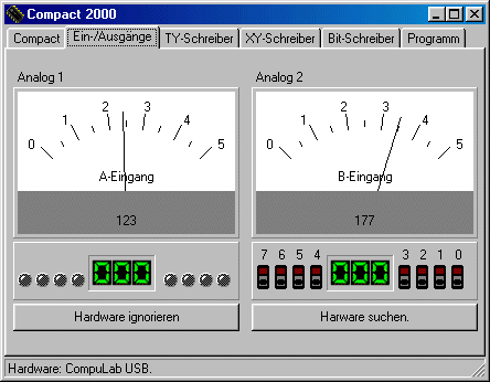 Das Programm Compact 2000 von H.-J. Berndt ist eine Weiterentwicklung seines Programms Do-It und wurde speziell für das CompuLAB-USB geschrieben. Es handelt sich hier um eine reine 32-Bit-Anwendung für Windows 98 und höher. Compact 2000 besitzt eine automatische Hardware-Erkennung. Außer dem CompuLAB-USB werden weitere Geräte an der seriellen Schnittstelle erkannt: CompuLAB, SIOS und die ZELLE. Das Programm unterstützt also auch das CompuLAB an der seriellen Schnittstelle und das SIOS-Interface (ohne Analogausgänge) und die ZELLE, wobei der Umfang der ünterstützten Ein- und Ausgänge der kleinste gemeinsame Nenner aller Geräte ist. Zusätzlich gibt es einen Simulationsmodus für den Betrieb ohne Interface.