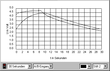 Die gewonnenen Daten können sehr einfach in andere Programme übertragen werden. Klickt man mit der rechten Maustaste in das Diagramm, dann erhält man die Auswahl "Kopieren" zur Übertragung der Grafik in die Zwischenablage oder "Kopieren als Text" zum Kopieren der Daten in Tabellenform. In der Tabellenform erhält man Messwerte in Volt und die zugehörigen genauen Zeitpunkte in Sekunden.