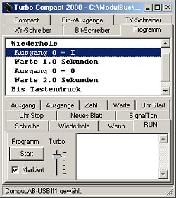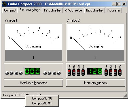Turbo Compact 2000 verwendet in der Version 1.20 Die automatische Interface-Erkennung. Wenn mehrere CompuLAB-USB gefunden wurden, lassen sich mit einem Rechtsklick auf die Geräteadresse auswählen. Man kann dann das selbe Programm ein zweites Mal laden und so mit zwei Geräten gleichzeitig arbeiten. Interessante Projekte ergeben sich, wenn man komplexe Aufgaben mit zwei oder mehr Geräten löst.