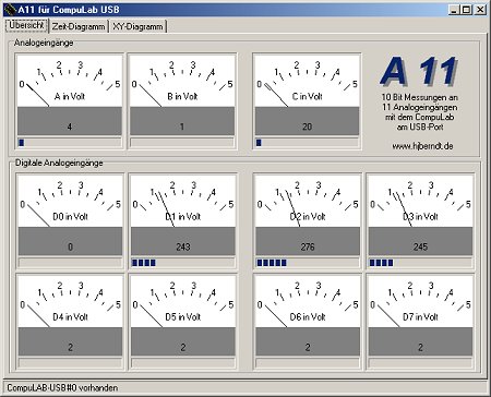 Ein Vorteil des USB gegenüber der seriellen Schnittstelle ist es, dass mehrere Geräte adressiert werden können. Viele PCs besitzen zwei oder sogar vier USB-Stecker. Wenn die Schnittstellen knapp werden, setzt man einfach einen USB-Hub ein, der aus einem Anschluss z.B. vier neue macht. Der aktuelle Treiber zum CompuLAB-USB unterstützt diese Möglichkeit. Zwei neue Programme von Hans-Joachim Berndt verwenden mehrere Geräte: Das neue Compact2000 und das Programm A11. Damit ergeben sich neue Möglichkeiten.