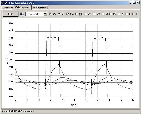 Das neue Programm A11 verwendet alle 11 Analogeingänge des CompuLAB-USB mit der vollen Auflösung von 10 Bit. Auch bei diesem Programm kann die Geräteadresse eingestellt werden. Das Programm wurde hier für eine Untersuchung von Signalen an den Eingängen D0 bis D3 benutzt, wobei die Eingangssignale gleichzeitig von einem zweiten CompuLAB-USB generiert wurden.