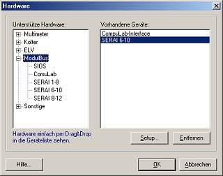 Jede Messung ist als eigenes Projekt organisiert. Zunächst muss die gewünschte Mess-Hardware gewählt werden. Im Beispiel wurden das CompuLAB an COM2 und das SERAI 6-10 an COM1 verwendet.