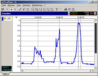 Nach dem Ende der Messung lassen sich die Daten in beliebigen Maßstäben darstellen. Das ist sinnvoll, wenn in unregelmäßigen Daten nach besonderen Ereignissen gesucht werden soll. Die folgende Messung zeigt eine Langzeitbeobachtung der Helligkeit mit einem LDR am SERAI 6-10. Ein Messcursor erlaubt z.B. die genaue Vermessung der aufgetretenen Maxima.