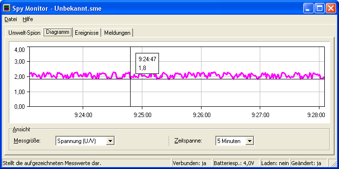 Spy Monitor ist dazu gedacht, im Hintergrund zu laufen und den Umwelt-Spion zyklisch abzufragen. Das Intervall zwischen den Messungen kann eingestellt werden und darf zwischen einer Sekunde und einer Minute betragen. Da bis zu 3600 Messwerte gespeichert werden, beträgt die maximale Auszeichnungsdauer 60 Stunden. Die gespeicherten Messwerte können in einem Diagramm dargestellt und in eine Textdatei exportiert werden.