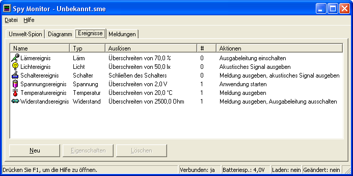 Für jede Messgröße lassen sich Ereignisse einrichten, die beim Über- oder Unterschreiten eines festlegbaren Grenzwerts bzw. beim Öffnen oder Schließen des Schalters ausgelöst werden. Bei dem Auslösen eines Ereignisses können Aktionen wie die Ausgabe einer Meldung, die Ausgabe eines akustischen Signals, das Schalten des Ausgangs des Umwelt-Spions oder das Starten einer Anwendung ausgeführt werden. Es können bis zu 100 verschiedene Ereignisse eingerichtet werden.