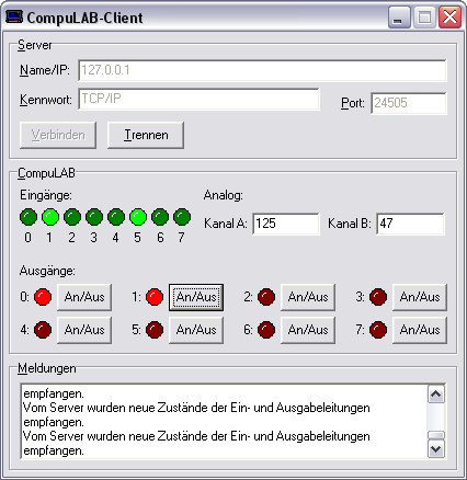 Mit der Befehlsschaltfläche "Verbinden" wird eine Verbindung zum Interface aufgebaut und mit der Befehlsschaltfläche "Trennen" wieder beendet. Die acht mit dem Schriftzug "Eingänge:" gekennzeichneten LEDs geben die Zustände der Eingabeleitungen wieder. Parallel dazu zeigen die acht LEDs, die mit "Ausgänge:" überschrieben sind, die Zustände der Ausgabeleitungen an. Besteht eine Verbindung zum CompuLAB, werden die LEDs der Eingabeleitungen grün und die der Ausgabeleitungen rot dargestellt, ansonsten sind alle LEDs grau. In den beiden Textfeldern, die mit "Kanal A:" und "Kanal B:" beschriftet sind, wird die Spannung der beiden analogen Eingänge als Werte zwischen 0 und 255 angezeigt.