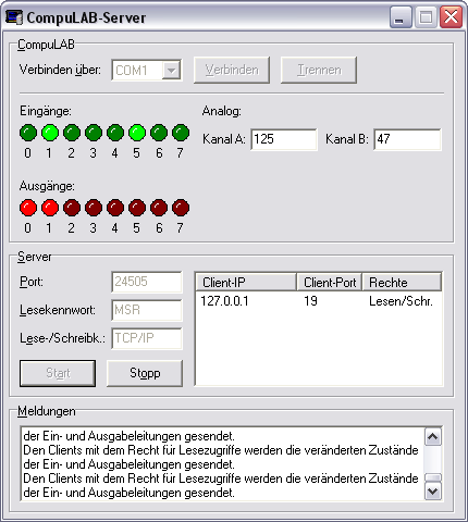 Damit nicht jeder auf das CompuLAB zugreifen kann, der über die Client-Anwendung verfügt und der die Adresse und Port-Nummer der Server-Anwendung kennt, erfolgt eine Absicherung durch Kennwörter. In den mit "Lesekennwort" und "Lese-/Schreibk." beschrifteten Eingabefeldern kann festgelegt werden, welches Kennwort ein Benutzer kennen und in die Client-Anwendung eingeben muss, damit er Leserechte oder Lese- und Schreibrechte erhält. Eine verbundene Client-Anwendung, der Leserechte erteilt wurden, zeigt ihrem Benutzer nur den aktuellen Zustand des CompuLAB an. Hat eine Client-Anwendung Lese- und Schreibrechte, kann ihr Benutzer zusätzlich die Ausgabeleitungen des Interfaces beeinflussen.