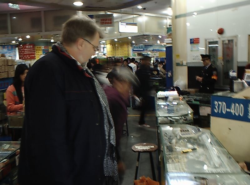 Diagonale Zebrastreifen In der Innenstadt gibt es Kreuzungen mit diagonalen Zebrastreifen und zugehörigen Ampeln, genial. Der Verkehr steht für vieles in China. Der erste Eindruck ist immer: das kann nie funktionieren, der zweite, das funktioniert ja hier noch besser als in Europa. Beispiel U-Bahn: Man muss eine elektronische (RFID-) Karte kaufen, ähnlich wie in Amsterdam. Man hält sie nur an den Automaten, kann auch im Portemonnaie bleiben. Das System merkt sich den Start und rechnet später beim Ziel den Fahrpreis aus. Wird automatisch von der Karte abgebucht. Später muss man mal neu aufladen. In den Bahnhöfen gibt es Glastüren am Bahnsteig, die sich öffnen wenn der Zug da ist. Keiner kann auf die Schienen fallen. Dagegen ist Deutschland ein Entwicklungsland. Die U-Bahn ist noch im Bau und geht noch nicht bis zum Hotel. Die U-Bahn-Baustelle ist nahe beim Hotel, nächstes Jahr ist alles fertig. Es gibt noch viele Baustellen in der Stadt. Eigentlich war das hier alles hügeliges Gelände. Aber wo ein Berg stört wird er weggebaggert. Das Material wird dann im flachen Meer aufgeschüttet, so entsteht neues Land. An einer Stelle sehe ich einen Hochspannungsmast, der stand mal auf einem Hügel. Rundherum ist jetzt alles flach, nur für den Mast hat man etwas stehen gelassen, vorläufig, vermute ich. Baustellen und Baufahrzeuge überall. Es staubt und ist laut. Und auf jeder Baustelle auffallend viele Arbeiter. Der Eindruck verdichtet sich, wenn die Chinesen etwas erreichen wollen, dann wird nicht lange gefackelt, dann tun sie es. Ein erster Besuch in der Stadt bei den Elektronik-Märkten in großen Hochhäusern. Ich schätze 10 Hochhäuser, je sechs Stockwerke, jede Etage hat ca. 100 Händler. Frau Peng, meine Übersetzerin und selbst im Elektronik-Geschäft ist immer dabei. Ohne sie wäre ich aufgeschmissen. Was kostet das, wie viele Stück denn, brauche 10 Stück, 100 RMB (ca. 10 EUR), ach so nein danke. Einige Sachen kaufe ich spontan. Aber vieles was man sucht gibt es nicht, man muss sehen was da ist, oft Sachen die man vorher gar nicht kannte. Fernsteuer-Servos kennt man hier z.B. nicht, zu teuer. In China baut man RC-Modelle mit eigenen Motoren, Zahnrädern usw. Es gibt nicht von allem beliebig fertige Ware, sondern auf den Märkten sind Vertreter der Herstellerfirmen, die nehmen Aufträge entgegen. 1000 Spulen mit 140 Windungen für Ferritstab 10 mm, kann gebaut werden. Motoren, 6 V, 1 W, Achse soundso, wird speziell nach Wunsch gefertigt. Sogar Kabel. 0,6 mm 1-m-Abschnitte, gelbe Isolierung, wird speziell für Sie gemacht. Nur die normalen elektronischen Bauteile sind in Massen da. Ein bestimmter Transistor? Oder 500-pF-Kapazitätsdioden, extrem selten in Europa, hier gibt es sie – wenn man den passenden Stand unter vielen tausenden findet.